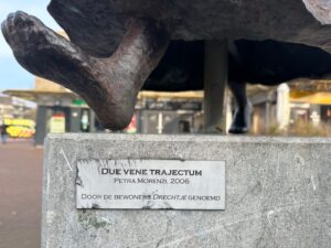 Deze week staat het beeld Due Vene Trajectum op het Dorpsplein in Duivendrecht centraal. Het is gemaakt door kunstenares Petra Morenzi en werd in 2006 onthuld. De naam klinkt misschien wat ingewikkeld, maar het betekent eigenlijk gewoon ‘oversteekplaats door het water’. Het kunstwerk stelt een doorwaadbare plek voor, zo’n plek waar je vroeger door het water kon oversteken. In een gebied vol moeras en water was zo’n oversteek superbelangrijk voor mensen. Door deze betekenis kreeg het beeld in 2013 de bijnaam ‘het Drechtje’.